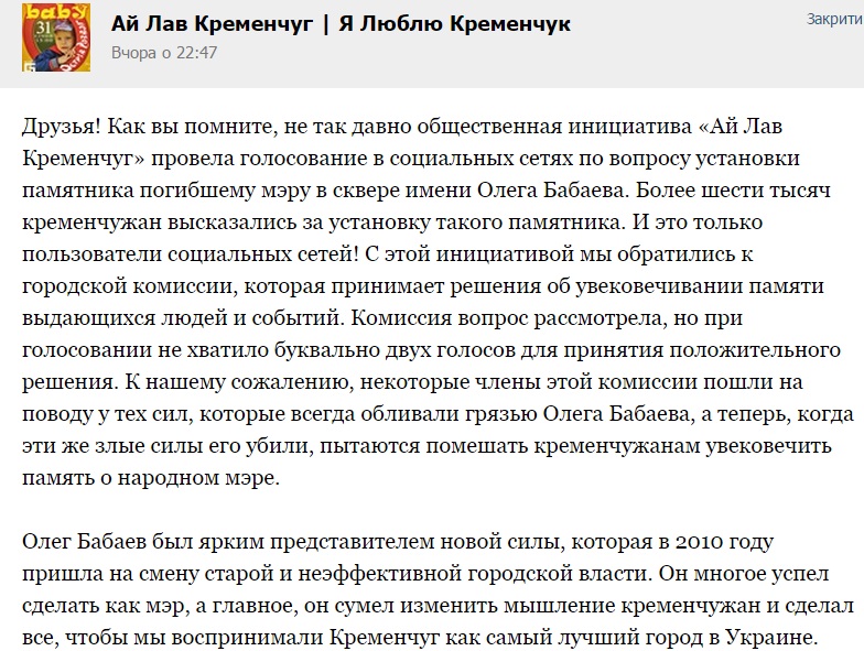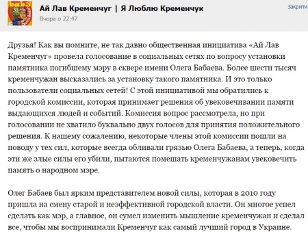 «К нашему сожалению, некоторые члены этой комиссии пошли на поводу у тех сил, которые всегда обливали грязью Олега Бабаева, а теперь, когда эти же злые силы его убили, пытаются помешать кременчужанам увековечить память о народном мэре.»