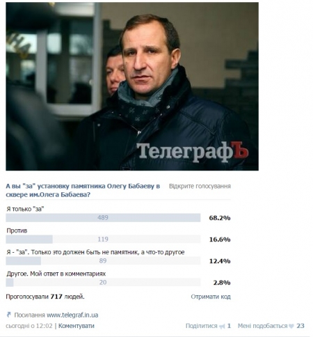 Альтернативный опрос на сайте «Телеграфа» показывает, что голоса «за» и «против» памятника Олегу Бабаеву разделились почти поровну с небольшим преимуществом «за».