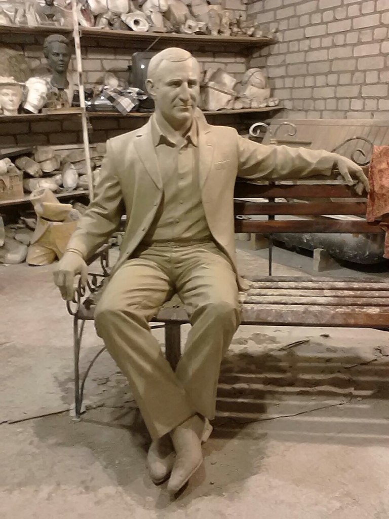 Вашему вниманию рабочий макет фигуры Олега Бабаева в натуральную величину из глины. По нему будет отлит бронзовый оригинал скульптуры. Лавочка на фото рабочая, для скульптурной композиции будет изготовлена бронзовая, отвечающая художественному замыслу, символизирующая "оборванную жизнь". Фото сделано в рабочей мастерской скульптора - Эльданиза Гурбанова, в городе Харькове.