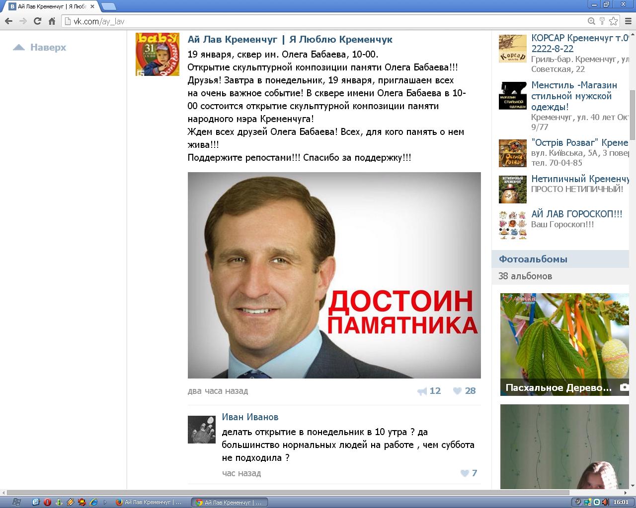 Завтра, 19 января, в 10:00 в Кременчуге откроют скульптуру бывшему мэру Олегу Бабаеву в одноименном сквере. Об этом сообщил Андрей Редькин, представитель сообщества «Ай лав Кременчуг» на своей странице в Фейсбук.
