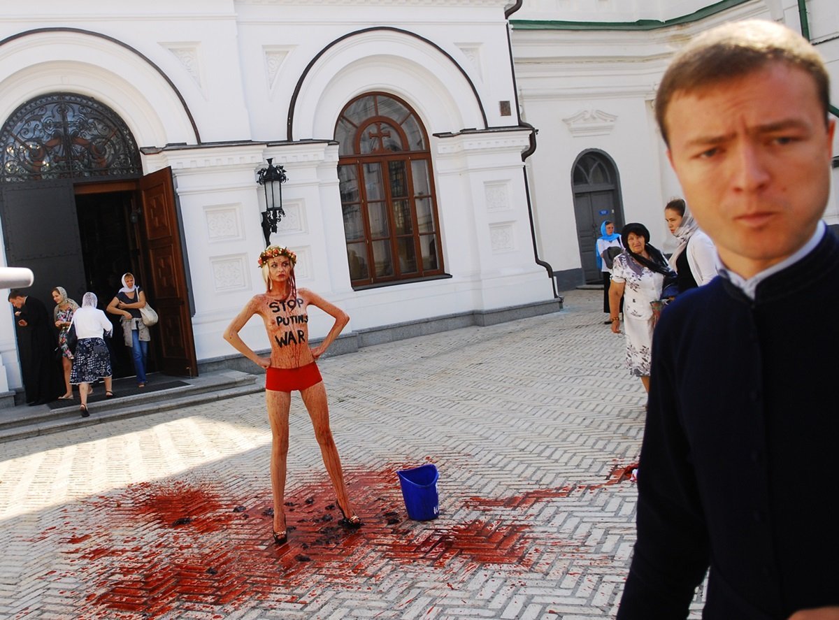 Наша соотечественница прославилась тем, что в сентябре минувшего года устроила Blood Bucket Challenge в Киево-Печерской лавре, вылив на себя ведро красной воды в знак протеста против кремлёвской политики, а в декабре прошлась по центру столицы с призывом согреть бойцов АТО.