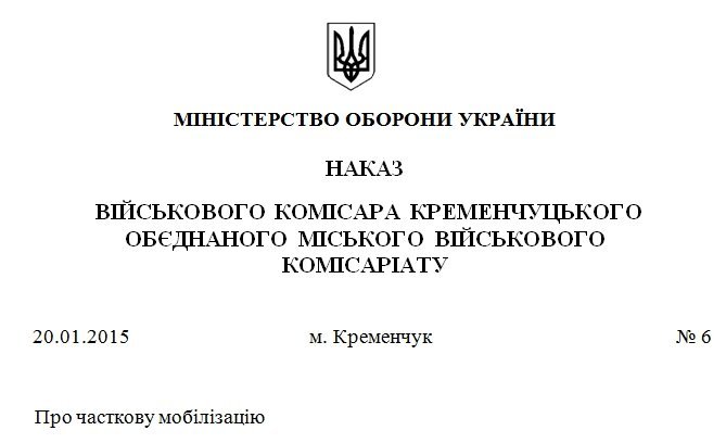 Приказ военного комиссара Кременчугского объединённого городского военного комиссариата от 20 января 2015 года №6 «О частичной мобилизации»