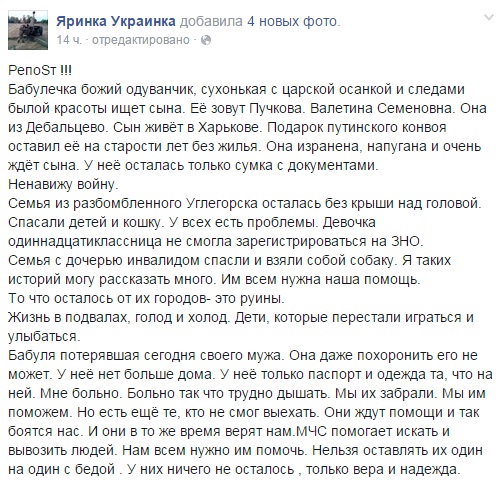На странице в Фейсбук Ирина оставила сообщение о раненой бабушке, которую они привезли: