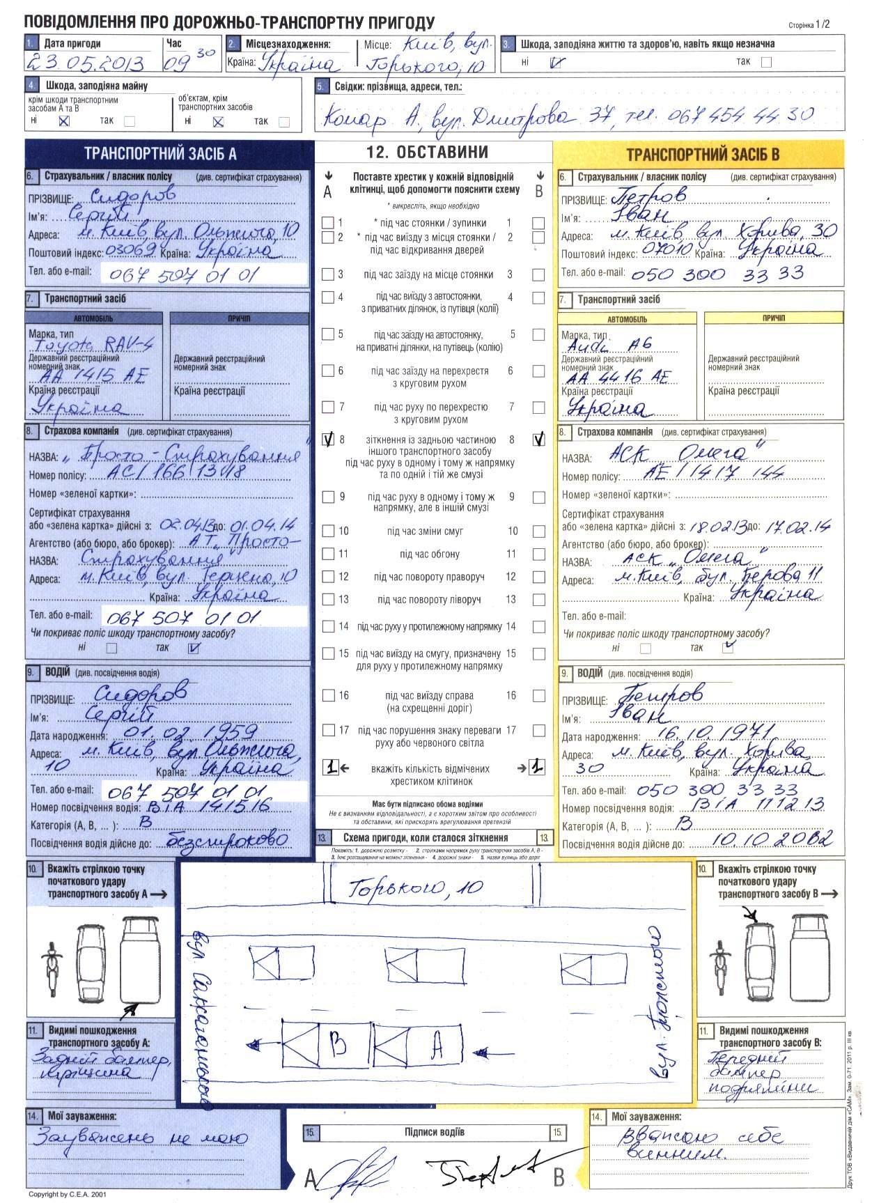 Пример заполения "европротокола"