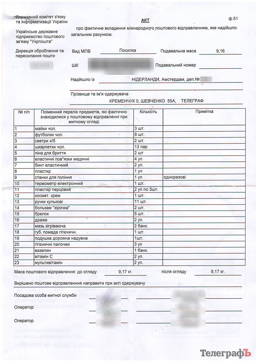 Перечень содержимого посылки: