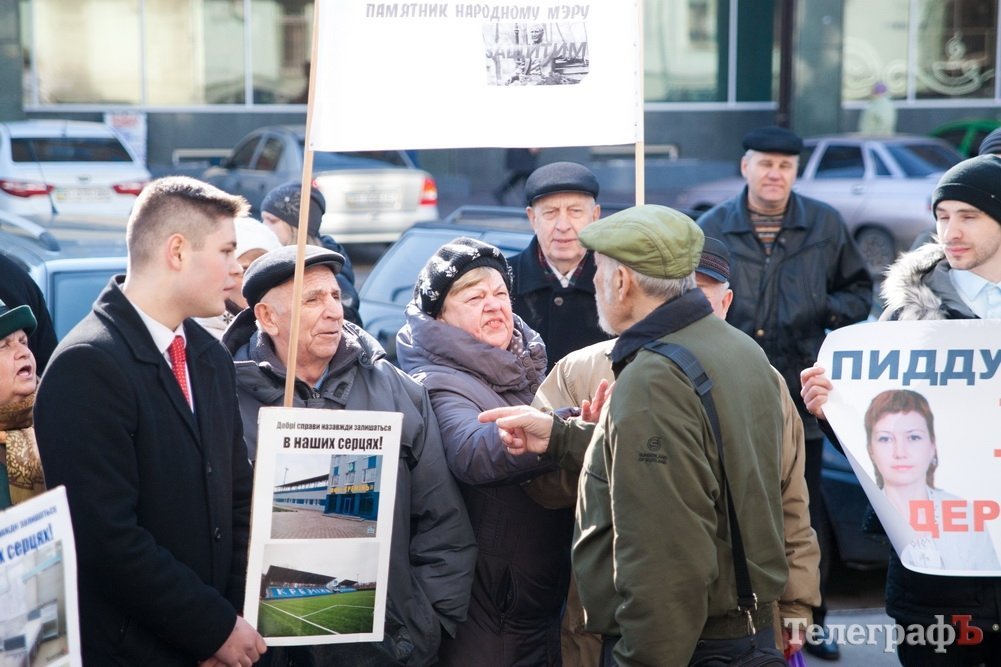 В руках у митингующих плакаты: «Пиддубная, ты че такая дерзкая», «Не дадим демонтировать памятник народному мэру», «Місто втратило батька, Піддубна втратила лавочку», «Залиште пам`ятник у спокої», «Не сотвори себе кумиров, не поклоняйся и не служи им».
