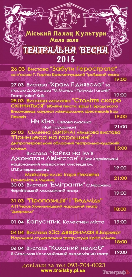 28 березня 19:00 - Вистава-молитва "Століття скоро скінчиться" Біблійні тексти, вірші І. Бродського. Виконавець - лауреат міжнародних фестивалів Ігор Пеховіч