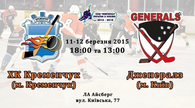 11-12 березня о 18:00 та 13:00 на льодовій арені «Айсберг» зустрінуться лідери чемпіонату України з хокею ХК «Кременчук» та столичний «Дженералз».