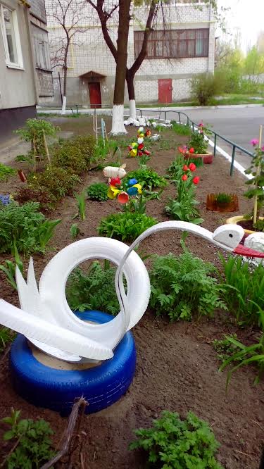 В переулке Героев Бреста жильцы дома 83 совместными усилиями убрали территорию, побелили деревья, покрасили бордюры, ограждения и лавочки, а такжде высадили цветы и других представителей флоры и фауны.