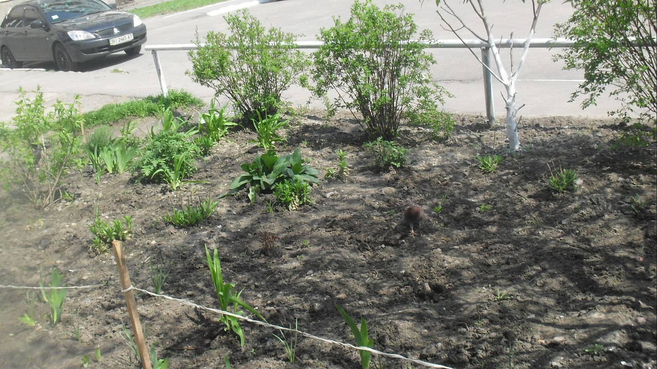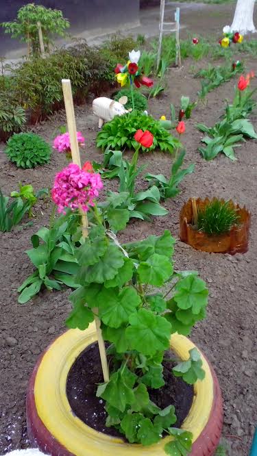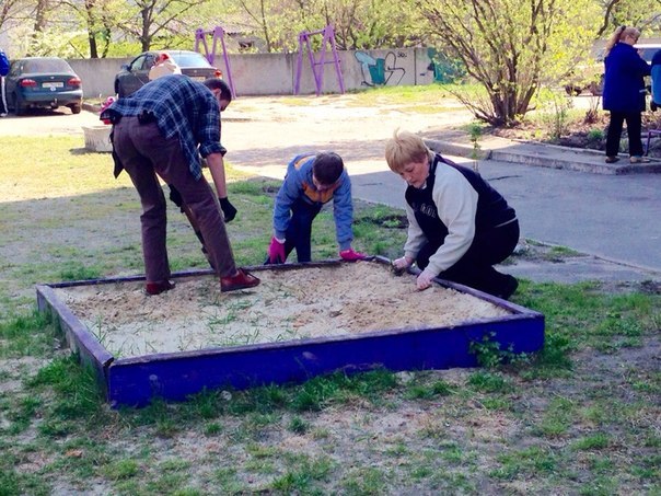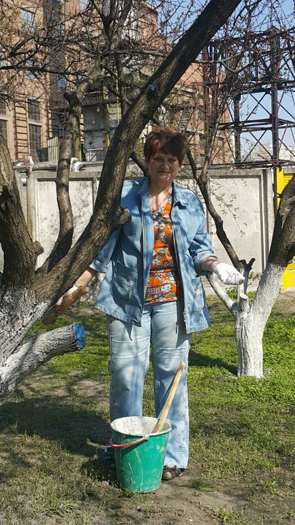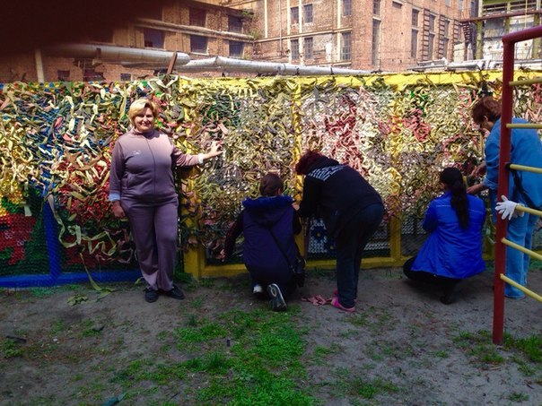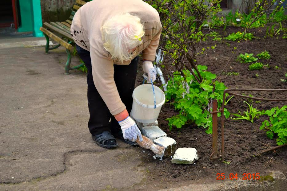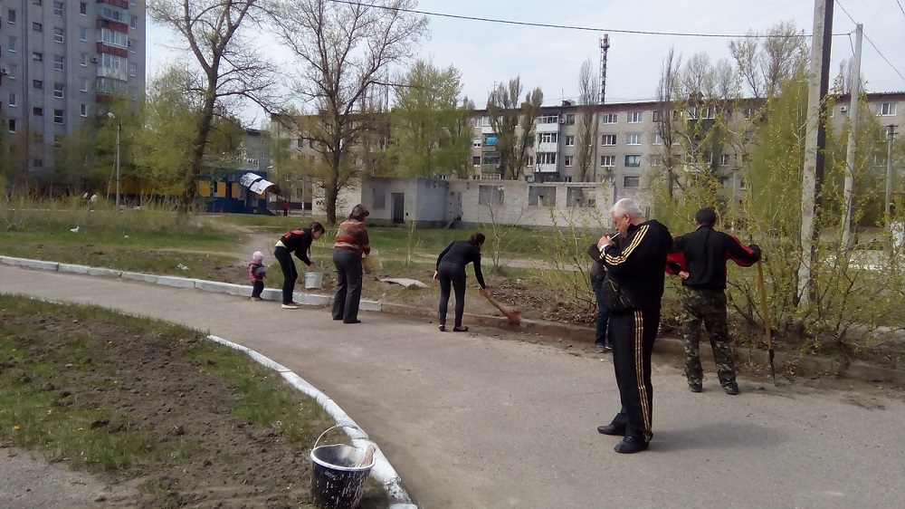 На Чкалова 1-Б помимо прочего красили деревья и садили цветы. А еще привели в порядок детскую площадку и сплели маскировочную сетку для АТО.
