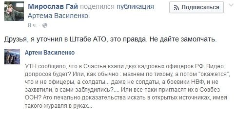 Руководитель благотворительного фонда «Мир і Ко», а в прошлом боец Национальной гвардии Мирослав Гай сообщил, что его источники в штабе АТО подтвердили взятие в плен двух кадровых российских офицеров.