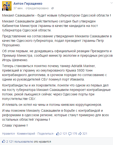 Михаил Саакашвили сегодня был утвержден Кабинетом Министров Украины в качестве кандидата на пост губернатора Одесской области. Об этом на своей странице Facebook сообщил народный депутат Антон Геращенко.