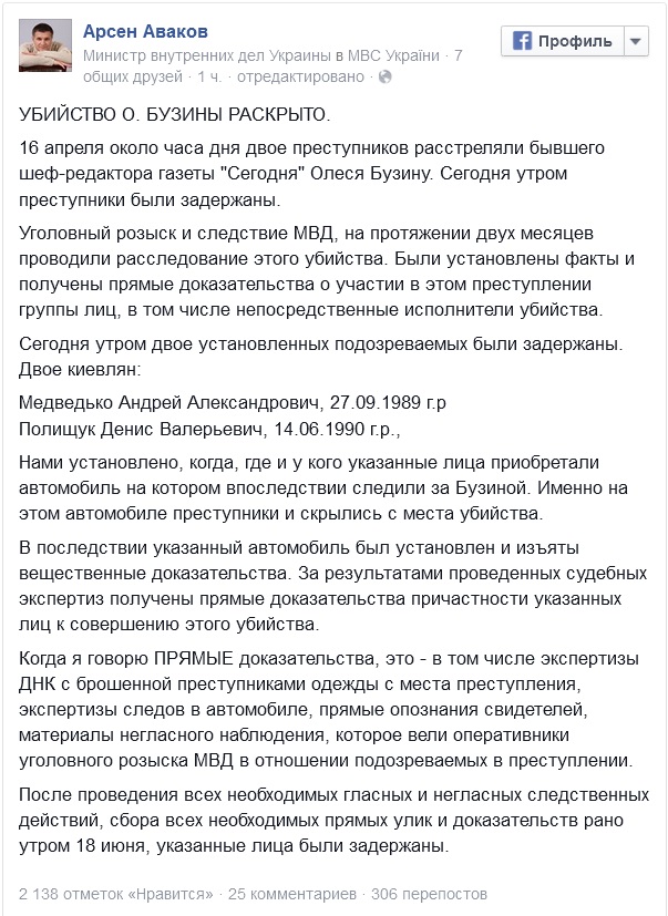 Утром, 18 июня, правоохранители задержали подозреваемых в убийстве бывшего шеф-редактора газеты "Сегодня". Об этом на своей странице в Фейсбуке сообщил министр внутренних дел Украины Арсен Аваков.