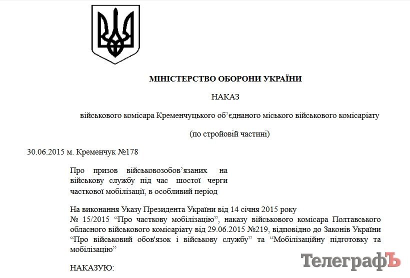 В Кременчуге в военкомат вызывают практически всех военнообязанных, включая тех, кто не получил повестку. Об этом говорится в п. 3 Приказа №178 от 30 июня 2015 года военного комиссара Кременчугского объединённого городского военного комиссариата Романа Сушко.