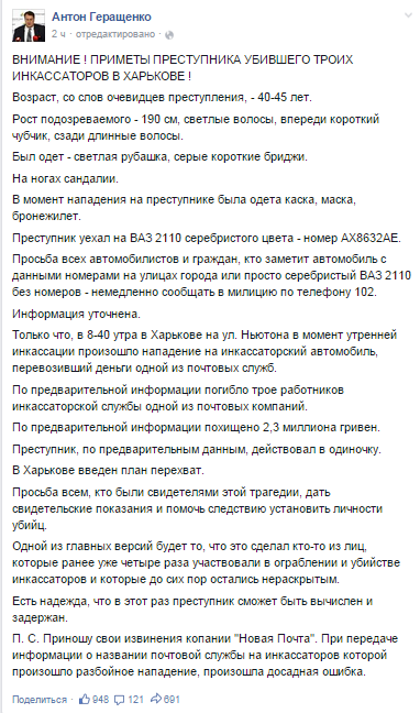 "Рост подозреваемого - 190 см, светлые волосы, впереди короткий чубчик, сзади длинные волосы. Был одет - светлая рубашка, серые короткие бриджи. На ногах сандалии. В момент нападения на преступнике была одета каска, маска, бронежилет", - говорится в сообщении Геращенко.