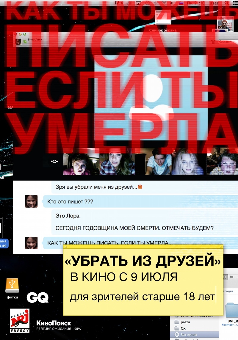 Вообще на рейтинг 18+ фильм не тянет, бояться не страшно. Попытка раскрыть тему женской груди заглохнет в самом начале. Убийства друзей мы видим через те же окна скайпа, а они реалистично дергаются вместе с ноутбуками – много ли там увидишь?