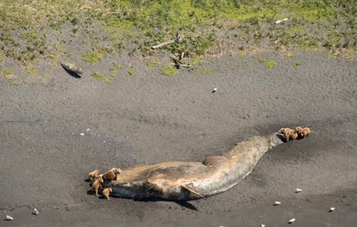 Похоже на маленькую мертвую рыбку пока не приглядишься и не поймешь, что это медведи Гризли окружают большого кита![]()