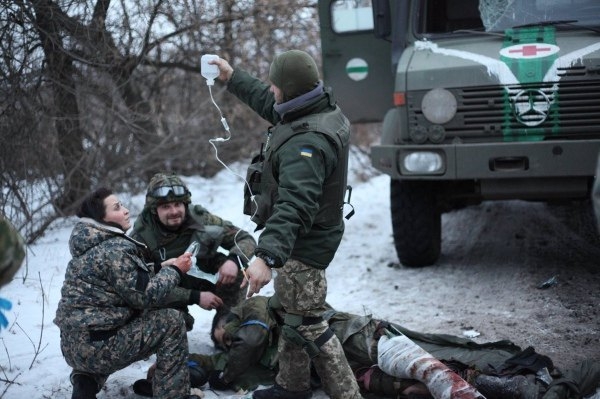 (на фото: Оля Башей "Кроха" спасает раненого)