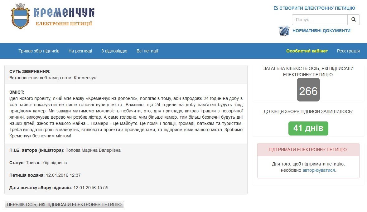 Петиция об установке по Кременчугу веб-камер с круглосуточной онлайн-трансляцией в рамках проекта «Кременчуг на ладонях» набрала уже 266 голосов. Этого достаточно для её рассмотрения мэром Виталием Малецким.