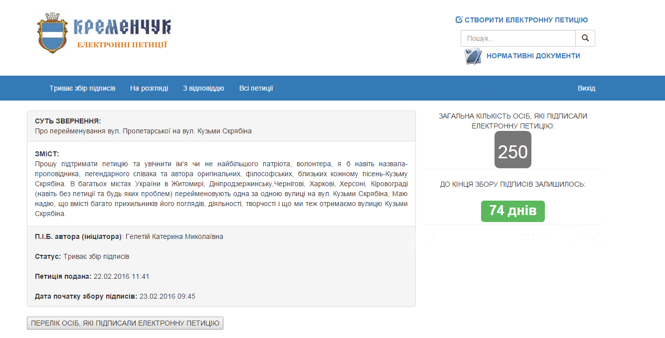 Менее, чем за месяц 250 кременчужан поддержали предложение назвать Пролетарскую улицу именем Кузьмы Скрябина.
