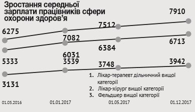 Зарплату медикам у 2017 році обіцяють збільшити на 20%. Із 1 січня зарплата хірурга вищої категорії становитиме 6 031 гривню, а з 1 грудня 2017 виросте до 6 713 грн.