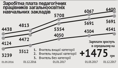 За підрахунками урядовців, середня зарплата учителя вищої категорії з 1 січня 2017 р. складе 5 708 грн, з 1 грудня 2017 р. – 6 400 грн, проти 4 813 грн на 1 грудня 2016 р.