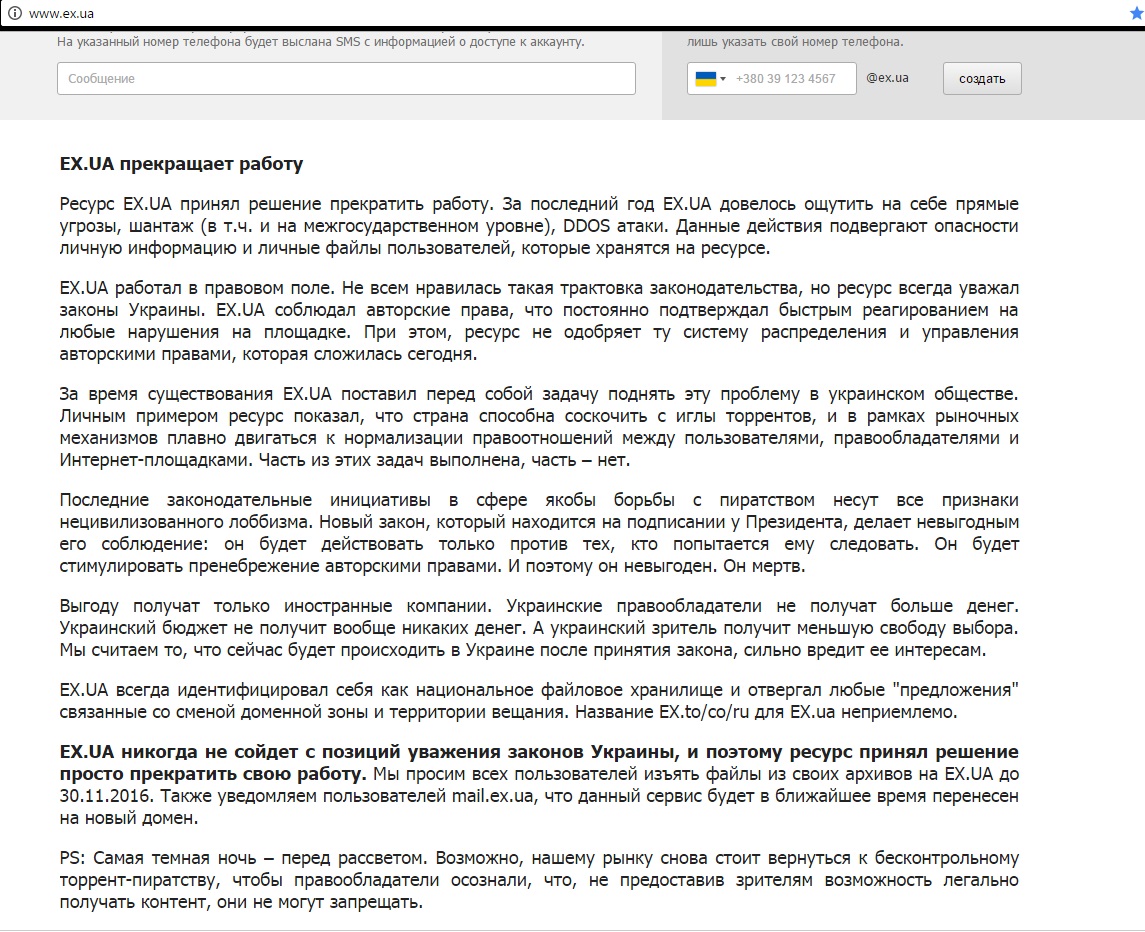 В сообщении авторы просят всех пользователей изъять файлы из своих архивов на EX.UA до 30.11.2016.