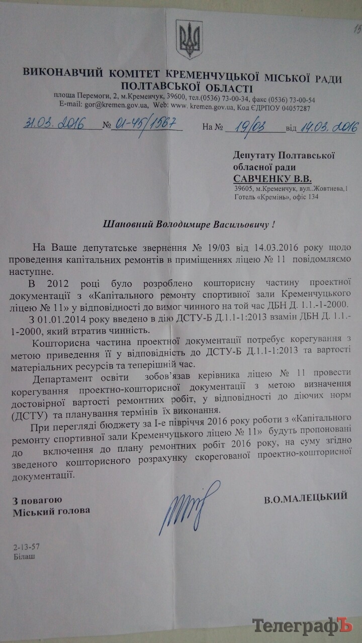 «ТелеграфЪ» заинтересовало, кто же из депутатов реально добивался ремонта спортзала лицея №11? Директор лицея сказала, что писем нардепа Шаповалова она не видела. А что делал депутат Полтавского облсовета Савченко, о котором вскользь упомянула директор лицея? Мы связались с депутатом Савченко. Он сказал, что написал гору запросов и обращений мэру Малецкому по поводу ремонта спортзала в лицее №11 и получил от него утвердительный ответ. «ТелеграфЪ» предложил Савченко показать эти запросы. Они перед вами.