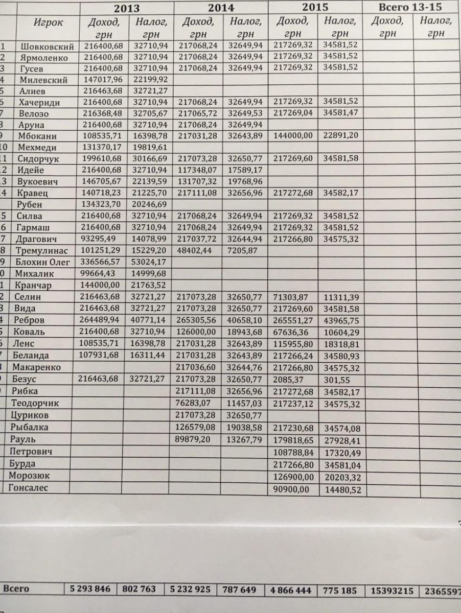 Також опублікували довідку про офіційні зарплати гравців команди впродовж 2013-2015 років, що складена на підставі даних Державної фіскальної служби.