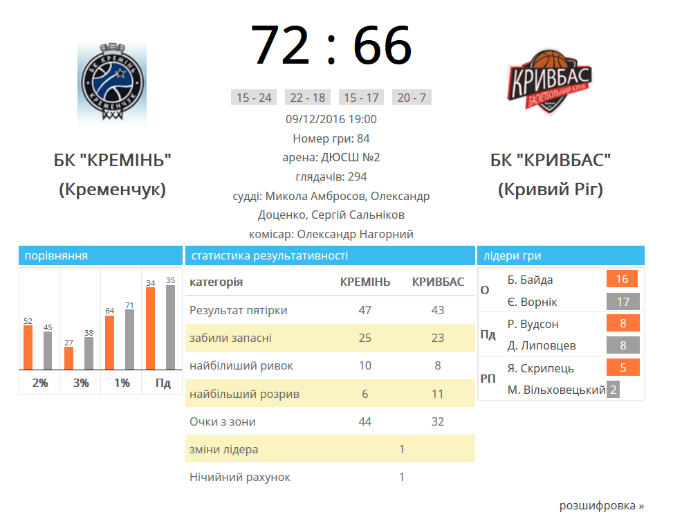 Від старту останньої десятихвилинки було помітно, що гравці «Кременя» налаштовані надзвичайно рішуче: після технічного фолу від «Кривбаса» перевага гостей зменшилася до одного пункту, а за 1.30 до завершення гри герой матчу, новачок Ярослав Кадигроб, вперше за чотири періоди вивів свою команду вперед, а ще за декілька секунд другою трьохою забезпечив таку необхідну перемогу своїй команді!