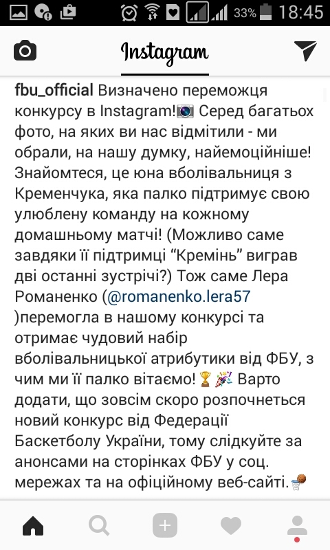 «Серед багатьох фото, на яких ви нас відмітили - ми обрали, на нашу думку, найемоційніше! Знайомтеся, це юна вболівальниця з Кременчука, яка палко підтримує свою улюблену команду на кожному домашньому матчі! (Можливо, саме завдяки її підтримці “Кремінь” виграв дві останні зустрічі?) Тож саме Лера Романенко перемогла в нашому конкурсі та отримає чудовий набір вболівальницької атрибутики від ФБУ, з чим ми її палко вітаємо!» - Зазначається у повідомленні.