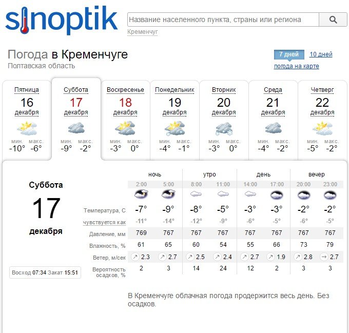 Sinoptik та Gismeteo на вікенд 17-18 грудня прогнозують від -9°С до -2°С у суботу та від -3°С до 0°С у неділю. В останній день тижня, за їх прогнозами, можливий невеликий сніг.