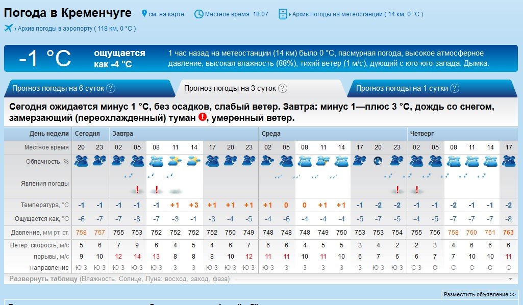 Rp5, крім поривів вітру від 8 до 15 м/с, застерігає про замерзаючий переохолоджений туман з видимістю менше 1 кілометра у першій половині дня та дощ зі снігом.