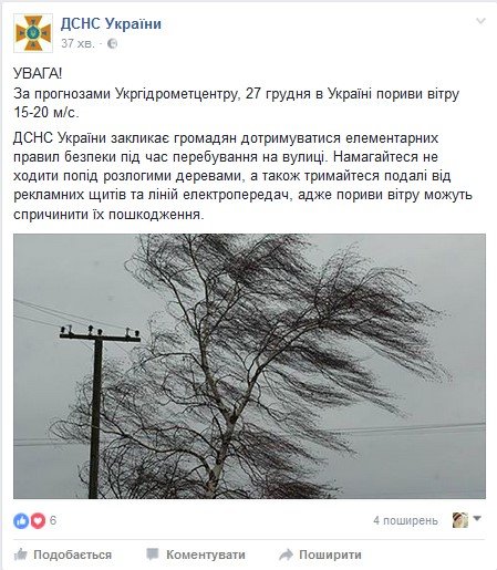 ДСНС України у своєму Facebook закликає громадян дотримуватися елементарних правил безпеки під час перебування на вулиці. Намагайтеся не ходити попід розлогими деревами, а також тримайтеся подалі від рекламних щитів та ліній електропередач, адже пориви вітру можуть спричинити їх пошкодження.