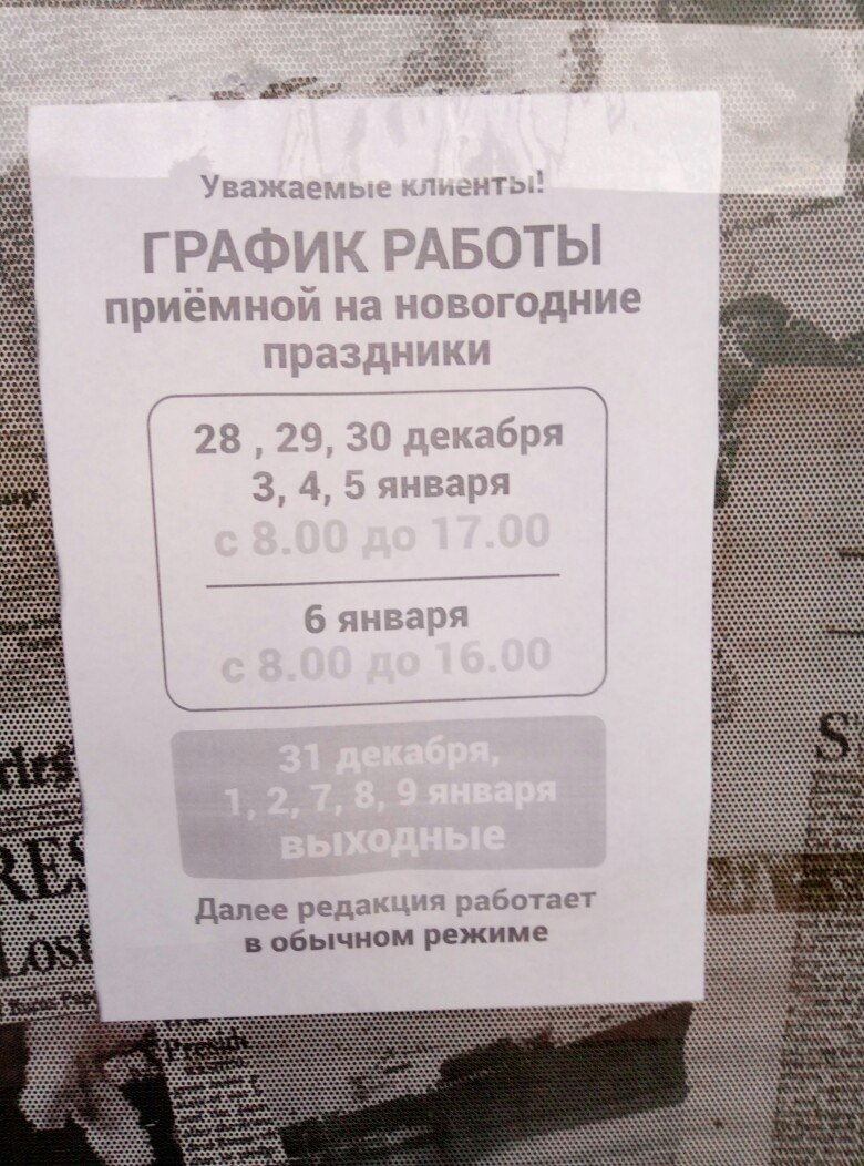 Уважаемые клиенты «Приватной газеты». Уведомляем вас, что приёмная на новогодние праздники работает по сокращённому графику: