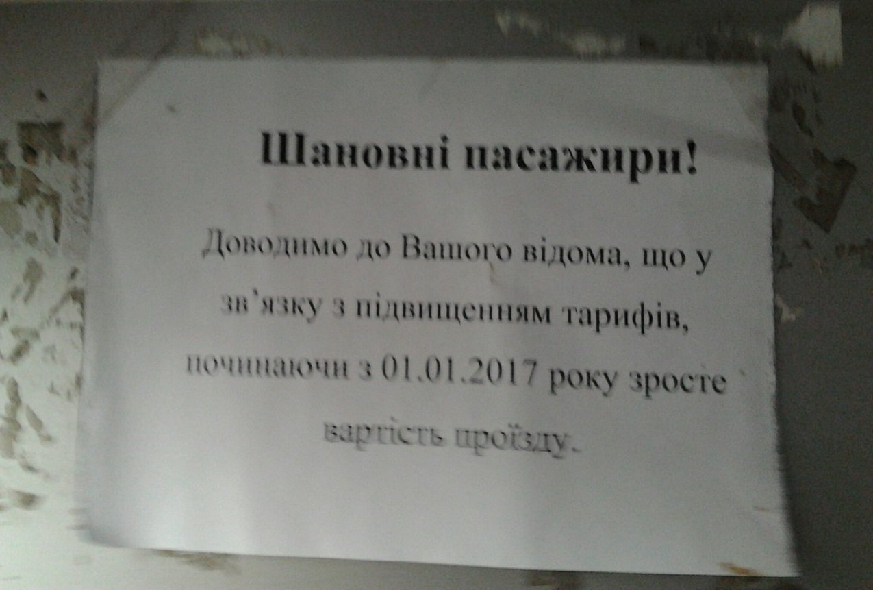 «У зв’язку з підвищенням тарифів, починаючи з 1 січня 2017 року зросте вартість проїзду», – йдеться в об’яві у маршрутці 231.