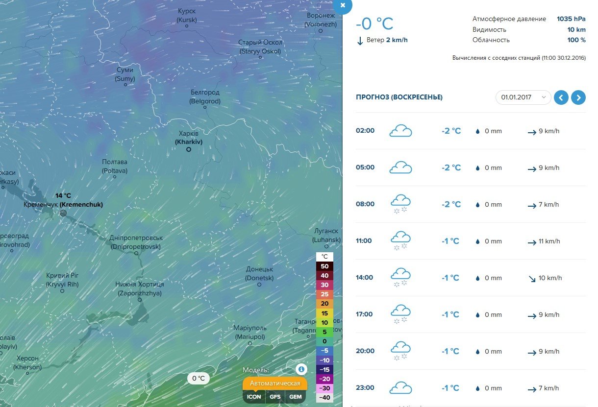 Ventusky попереджає про туман вранці 31 грудня та обіцяє сніг протягом усього 1 січня.