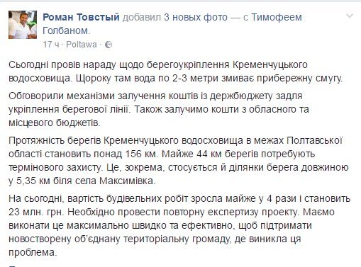10 января заместитель председателя Полтавской ОГА Роман Товстый провел заседание по поводу укрепления берега Кременчугского водохранилища. Об этом он написал на своей странице в фейсбук.