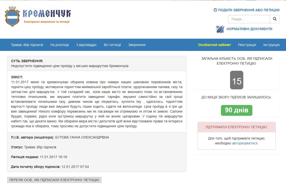 12 січня на сервісі електронних петицій мерії стартував збір підписів під черговим зверненням до мера Кременчука Віталія Малецького.