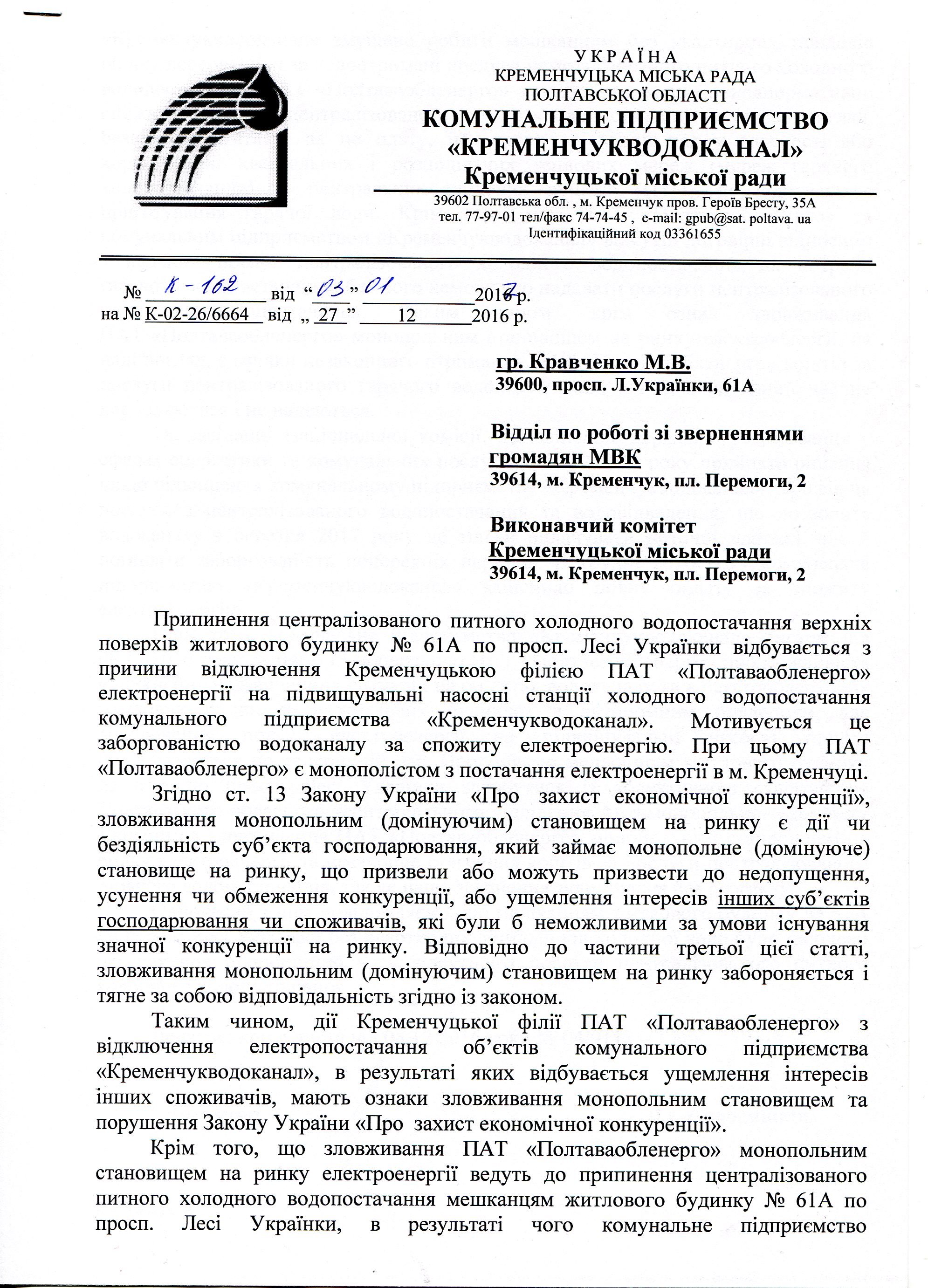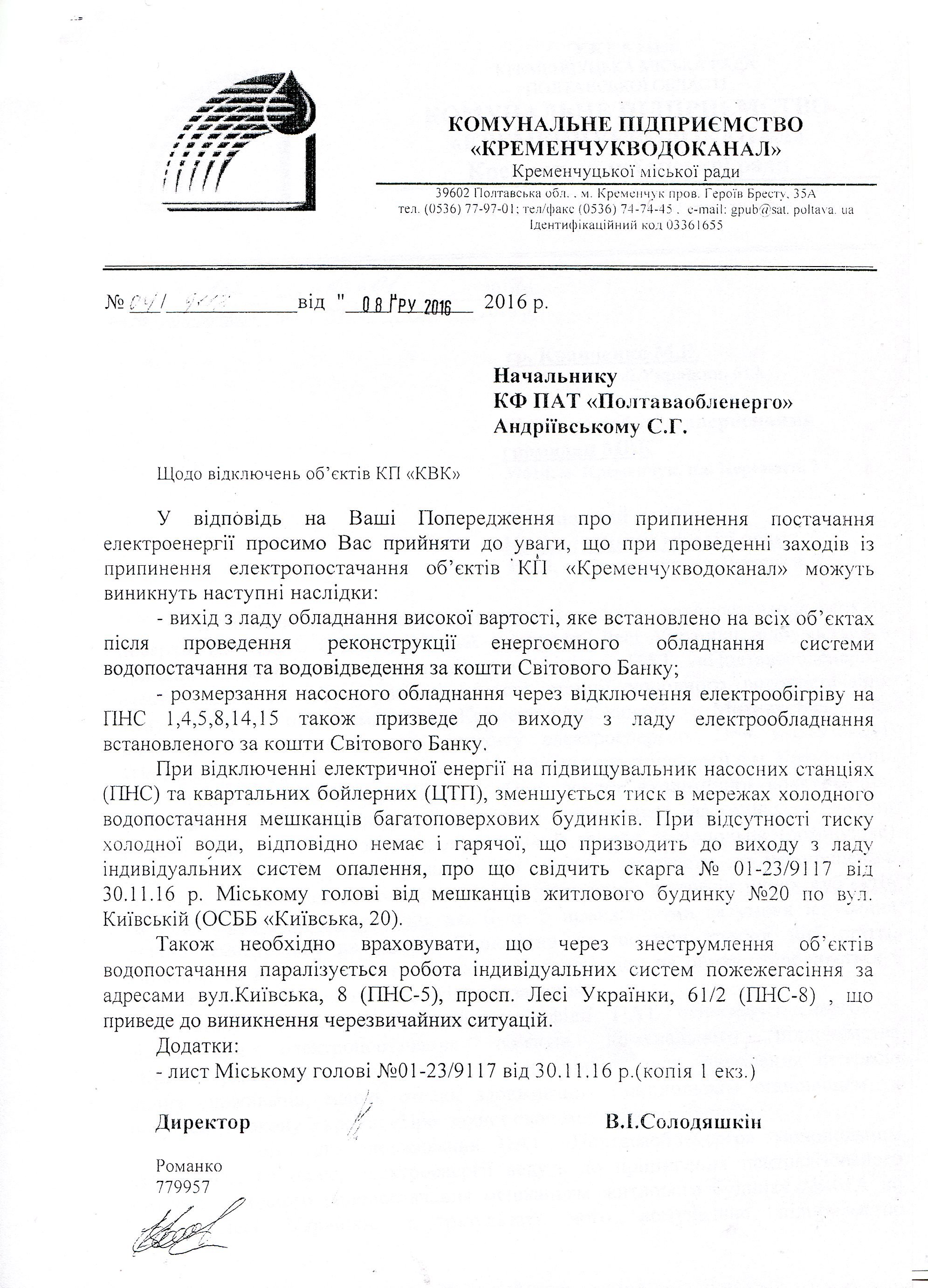 Напоминаем, состоянием на 4 января долг КП "Кременчугводоканал" перед ПАО "Полтаваоблэнерго" сотавлял 16 млн грн.