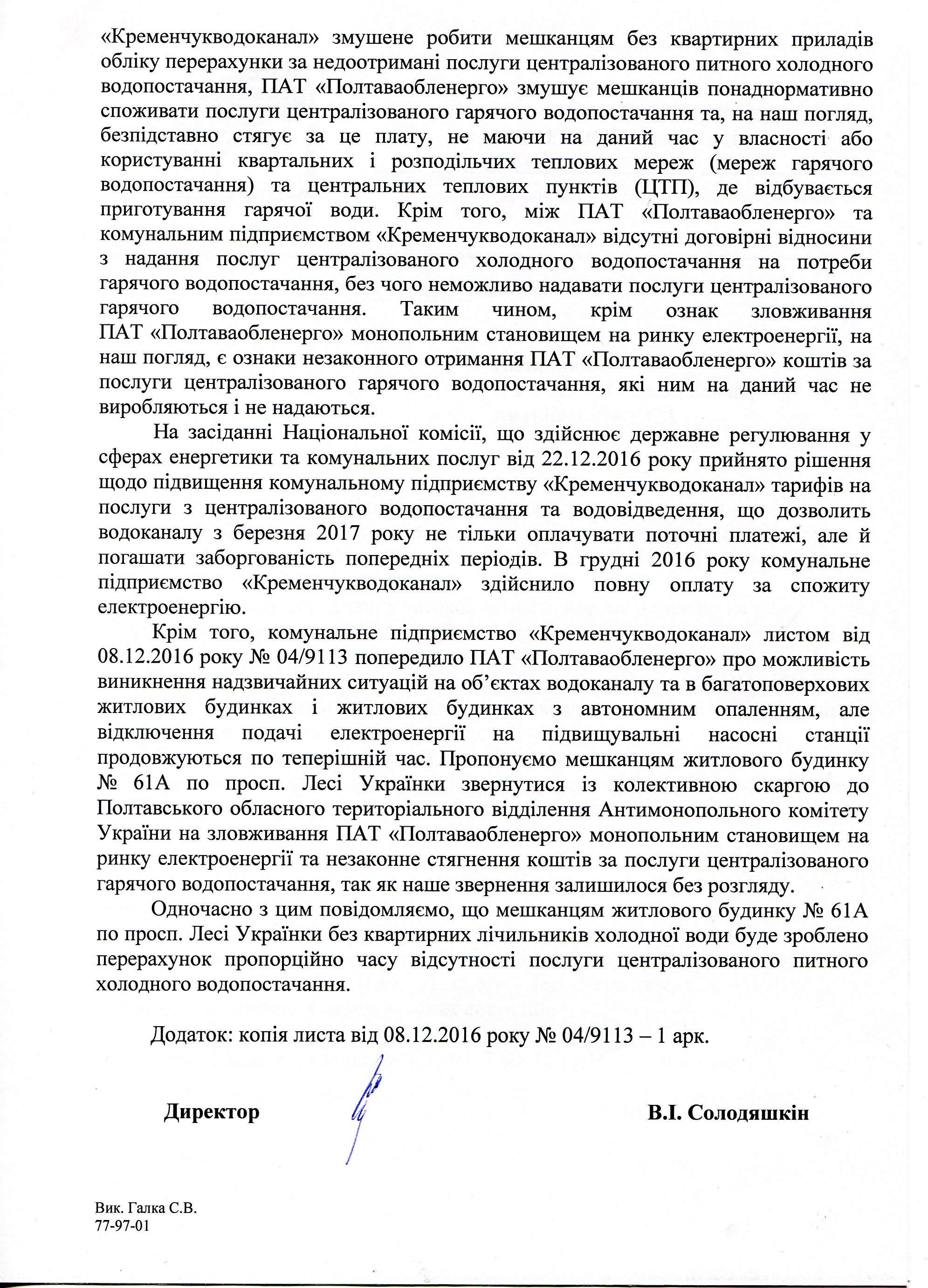 - Добрый вечер! Не знаю уже куда еще обращаться, пишу в средства массовой информации, может хоть как -то дело сдвинется с места. Суть дела вот в чем: уже более двух месяцев в доме 61А по проспекту Леси Украинки каждый день (кроме выходных, спасибо хоть тут) с утра до позднего вечера отключают холодную воду (к слову, горячей воды в доме нет совсем, но это уже не удивительно). В доме постоянно ведутся ремонтные работы в квартирах нижних этажей, и на верхние поднимается вся пыль, но влажную уборку в квартирах (ГДЕ ЖИВУТ МАЛЕНЬКИЕ ДЕТИ и дышат этой пылью) можно сделать либо до 07:00 утра либо после 21:00 вечера. А также стирка, готовка и т.д. тоже только в это время. Это нормально вообще?? А самое главное - крайних в этом вопросе не найдешь, точнее, крайние есть, но разобраться с ними никто не может. «Горводоканал» обвиняет «Полтаваоблэнерго», «Полтаваоблэнерго», в свою очередь, «Горводоканал», что они должны деньги и не рассчитываются. На горячей линии мэра убедительно отвечают, что мэр чуть ли сутками не спит, в поте лица решает этот вопрос (только результата 0, уже более двух месяцев), а на заявку на Правительственной горячей линии пришел ответ, который можно заменить словосочетанием "решайте свои вопросы сами" . Короче говоря, никто никому не нужен со своими проблемами. И что самое интересное и непонятное, долг что, только за один наш дом или как? Так как в соседних домах вода есть постоянно. В общем, замкнутый круг какой-то: платишь бешеные деньги за комуслуги и комфорт, который должен быть за такие тарифы на высшем уровне, а его нет вообще. Кто ответит людям за этот дискомфорт и решит эту проблему - непонятно! - написала в редакцию «Телеграфъ» Марина.