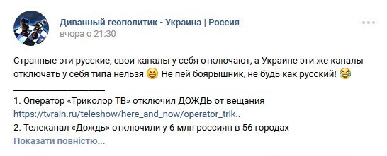 12 января Национальный совет по вопросам телевидения и радиовещания Украины обязал провайдеров в течение месяца прекратить трансляцию российского телеканала "Дождь". На соответствующий шаг ведомство пошло из-за непризнания каналом суверенитета и территориальной целостности Украины, а также трансляцию российской рекламы.