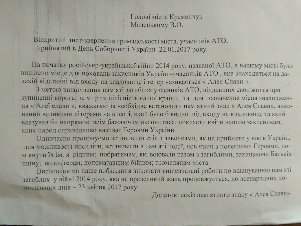 22 січня на літературному вечорі у Кременчуці громадяни, за ініціативи активістки Валентини Трохименко, склали та підписали лист-звернення міському голові Віталію Малецькому про встановлення на Свіштовському кладовищі пам'ятний знак «Алея Слави», присвячений загиблим у російсько-українській війні бійцям.