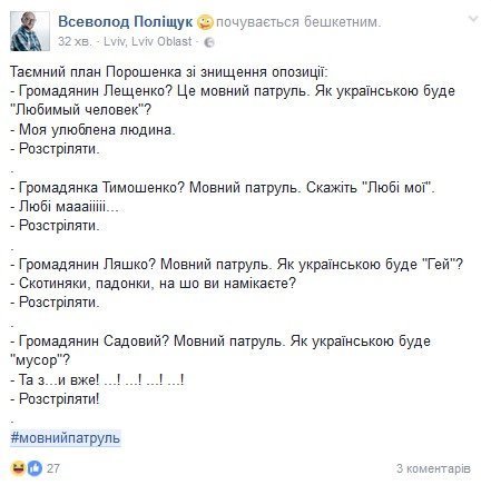 Користувачі соціальних мереж створили новий караючий орган – #МовнийПатруль, який слідкує за чистотою мови. Таким чином люди відреагували на проект «Закону про державну мову» №5670, поданий на розгляд парламенту 19 січня.