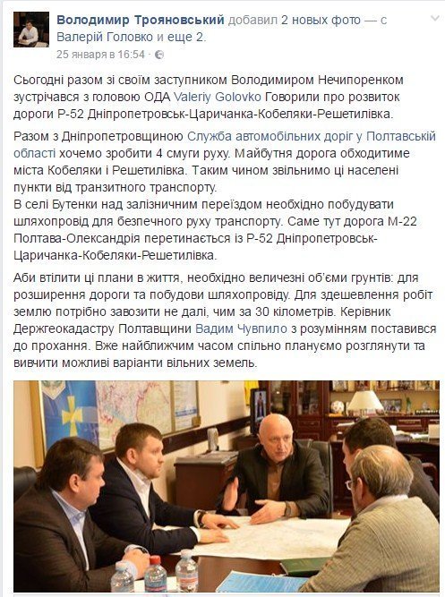 Чтобы воплотить эти планы в жизнь, необходимы огромные объемы почв: для расширения дороги и построения путепровода. Для удешевления работ землю нужно завозить не дальше, чем за 30 километров. Руководитель Госгеокадастра Полтавщины Вадим Чувпило с пониманием отнесся к просьбе. Уже в ближайшее время совместно планируем рассмотреть и изучить возможные варианты свободных земель, – сообщил Владимир Трояновский.
