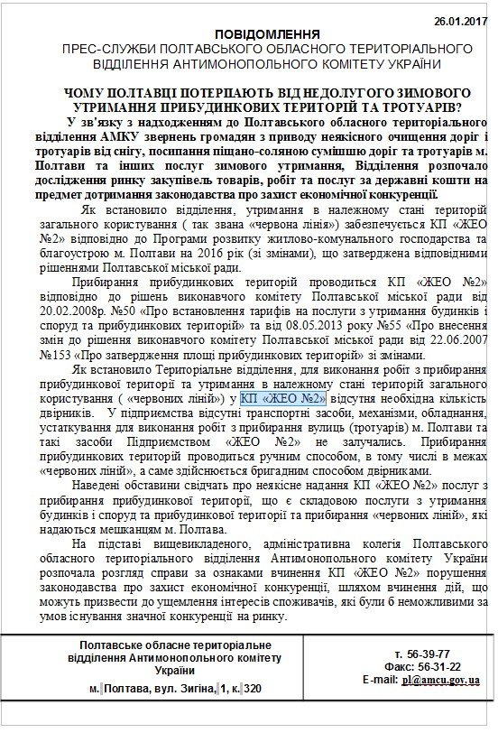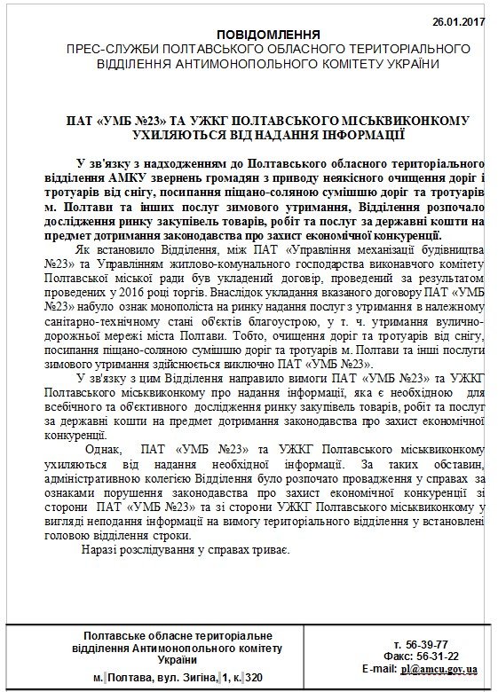 За очистку улично-дорожной сети города в Полтаве отвечает предприятие ОАО «Управление механизации строительства №23». Т.е., за предприятием закреплены очистка дорог и тротуаров от снега, посыпка песчано-соляной смесью дорог и тротуаров и другие услуги зимнего содержания. Договор с ОАО «Управление механизации строительства №23» горсовет Полтавы заключил в 2016 году, сделав предприятие также монополистом.