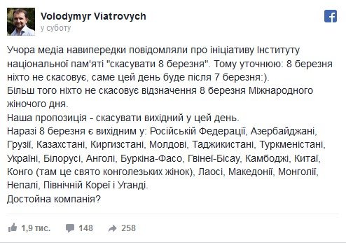 Реагируя на ажиотаж, Владимир Вятрович поспешил объяснить на своей странице в Facebook, что никто не собирается отменять полюбившийся многим «женский день». Институт памяти просто предлагает оставить его рабочим:
