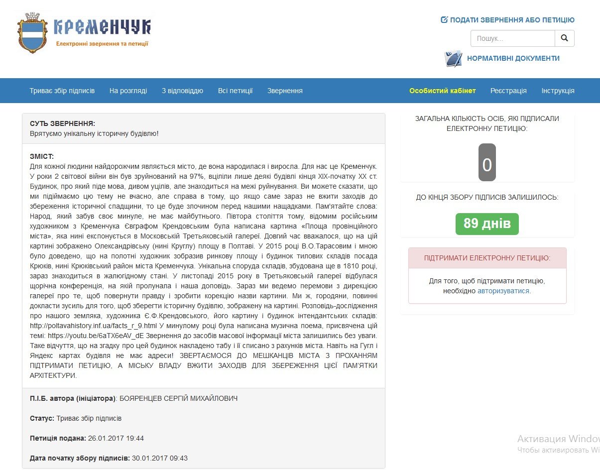 30 січня на сервісі електронних петицій мерії з'явилось нове звернення до мера Кременчука Віталія Малецького. Сергій Бояренцев просить міського голову врятувати унікальну історичну будівлю - інтендантські склади Крюкова.