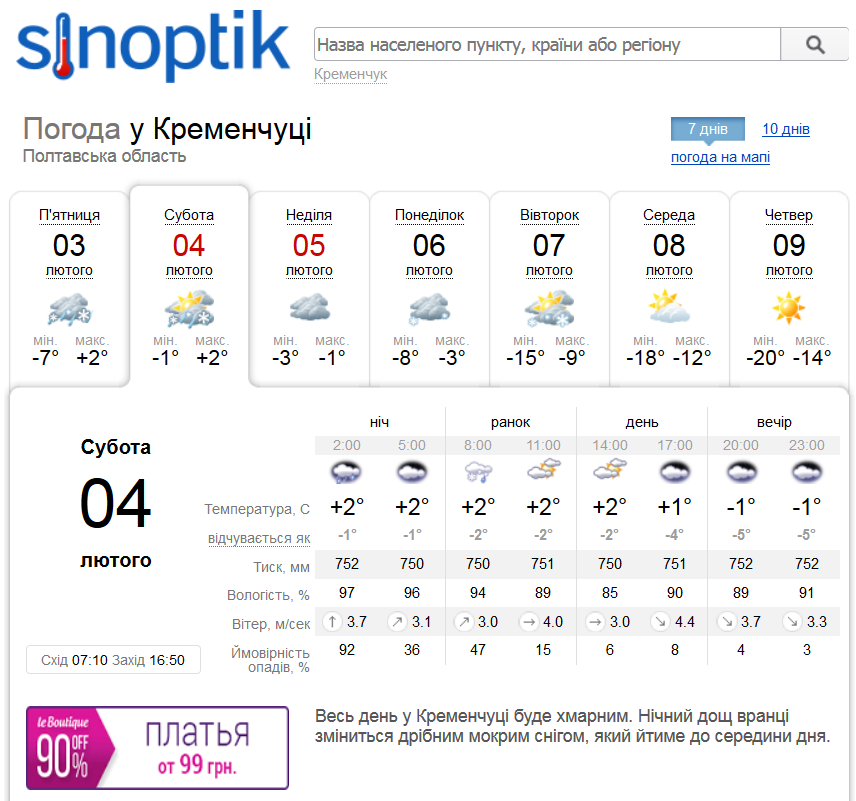 За прогнозом rp5, у суботу, 4 лютого, місто оповиє серпанок з видимістю від 1 до 9 км. Вночі можлива злива, а зранку - невеликий дощ. Температура повітря коливатиметься від 0оС до +1оС. У неділю, 5 лютого, увесь день у Кременчуці сніжитиме, а мороз досягне -5ºС.