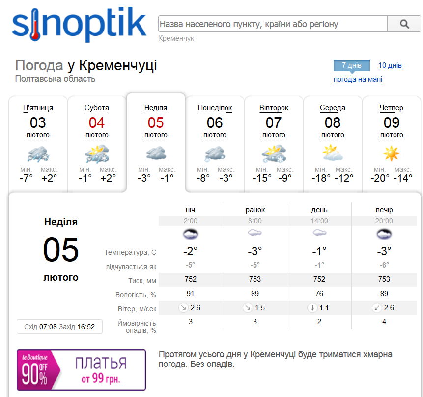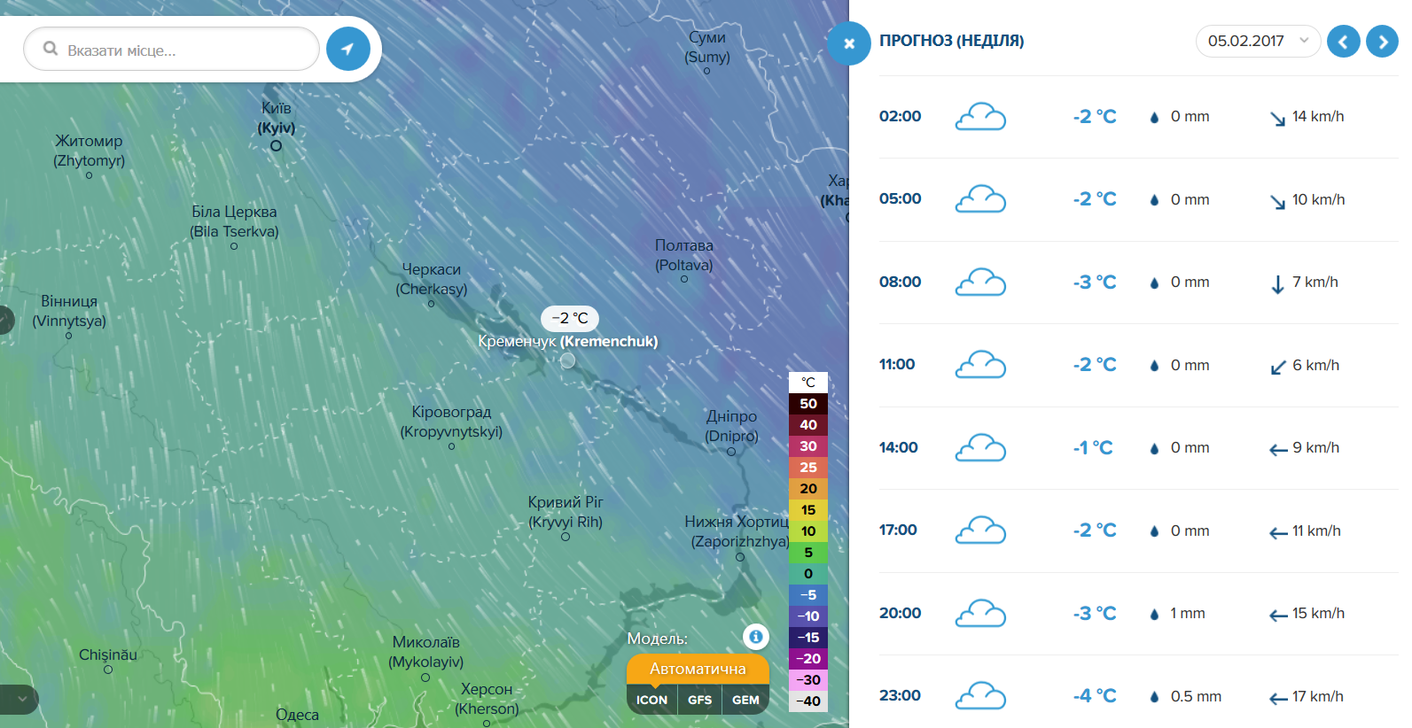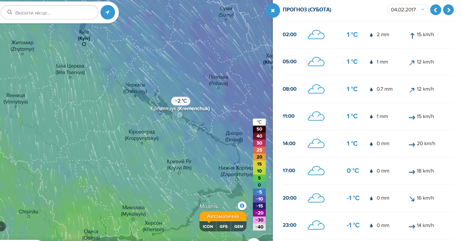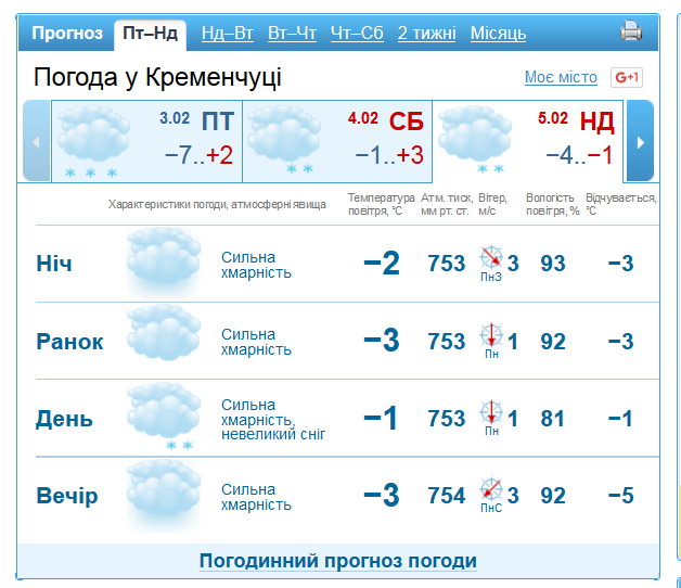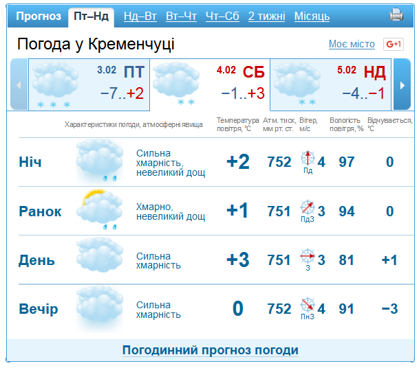 Невеликий дощ зранку, 4 лютого, та температуру повітря до +3ºС обіцяє Кременчуку Gismeteo. А вже в неділю, 5 лютого, вдень, тут прогнозують невеликий сніг та мороз до -3ºС.
